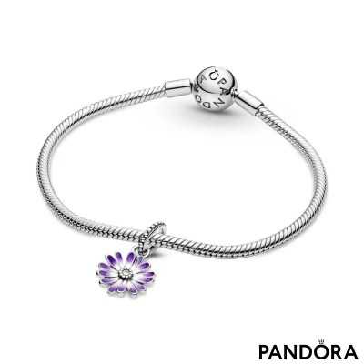 Este colgante de plata de ley acabado a mano está decorado con pétalos de margarita pintados con esmalte lavanda, púrpura y blanco.